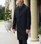 55% polyester 45% wool. Single breasted, 3 button fly front, centre vent, raglan sleeve, viscose check lining. Centre back length at size 40R = 102cm